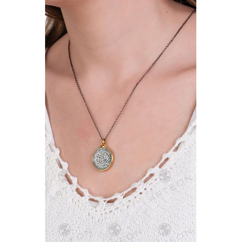 Κομψό και συμβολικό, αυτό το κολιέ από ασήμι 925° διαθέτει στρογγυλό μενταγιόν με ανάγλυφο Δίσκο της Φαιστού στο κέντρο, επιμεταλλωμένο με μαύρη πλατίνα και πλαισιωμένο από επίχρυσο στεφάνι. Ο Δίσκος της Φαιστού αποτελεί αρχαιοελληνικό φυλαχτό και διακοσμητικό σύμβολο, συνδεδεμένο με την προστασία, την αρμονία και την αιωνιότητα.