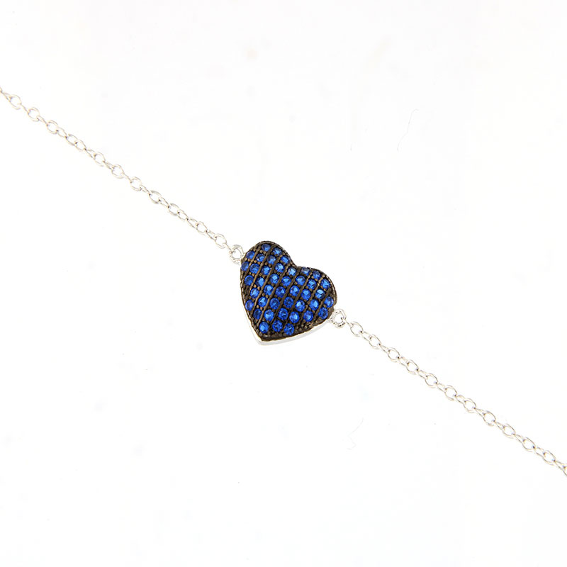 Κομψό και ρομαντικό γυναικείο βραχιόλι από ασήμι 925, με μοτίβο καρδιάς πλήρως διακοσμημένο με λαμπερά μπλε ζιργκόν. Το φωτεινό μπλε χρώμα προσδίδει κομψότητα και εντυπωσιακή λάμψη, αναδεικνύοντας τη θηλυκότητα και συμπληρώνοντας ιδανικά κάθε εμφάνιση.
