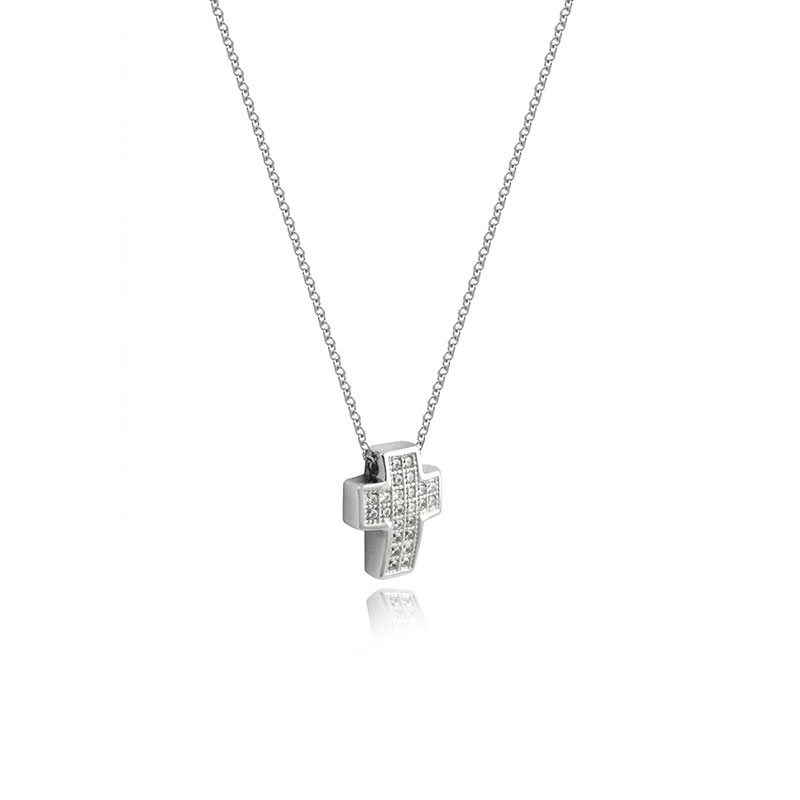 Κομψός γυναικείος σταυρός μικρού μεγέθους, κατασκευασμένος από λευκό χρυσό 14 καρατίων, διακοσμημένος με λαμπερά λευκά ζιργκόν που προσδίδουν διακριτική λάμψη και φινέτσα